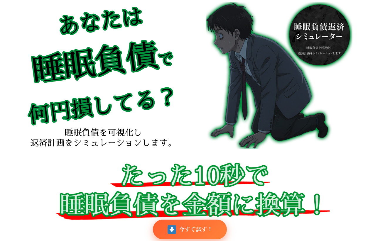 また、睡眠負債をわかりやすく可視化するために、金額換算が可能なシミュレーターも用意しています。現在の睡眠負債の算出だけでなく、改善に向けてどれくらいの睡眠時間を確保できるかを入力すると、完全に返済できるまでの日数が算出されます。この睡眠負債とその影響をチェックする質問票もサイト内に配置されておりますので、ぜひお試しください!